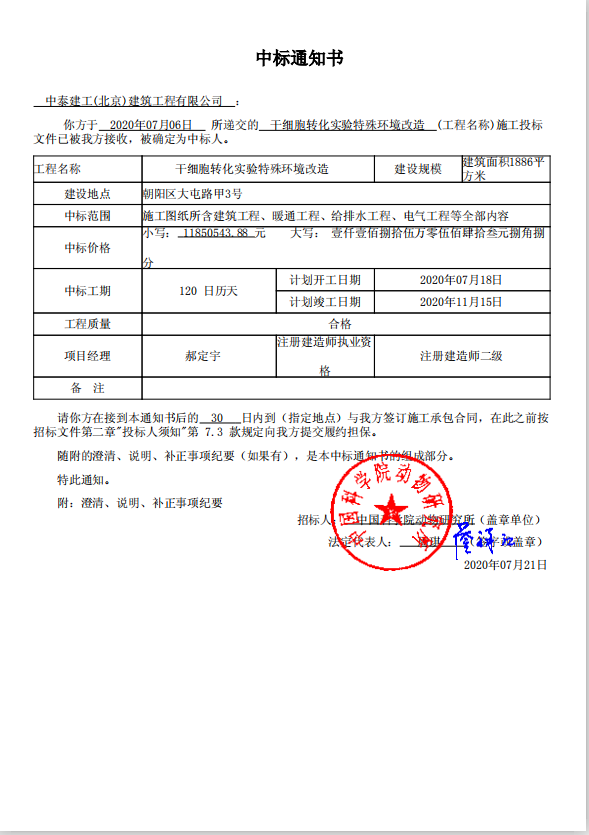 中泰建工喜訊不斷,捷報連連,成功中標「中國科學院動物研究所干細胞實驗室凈化工程項目」。