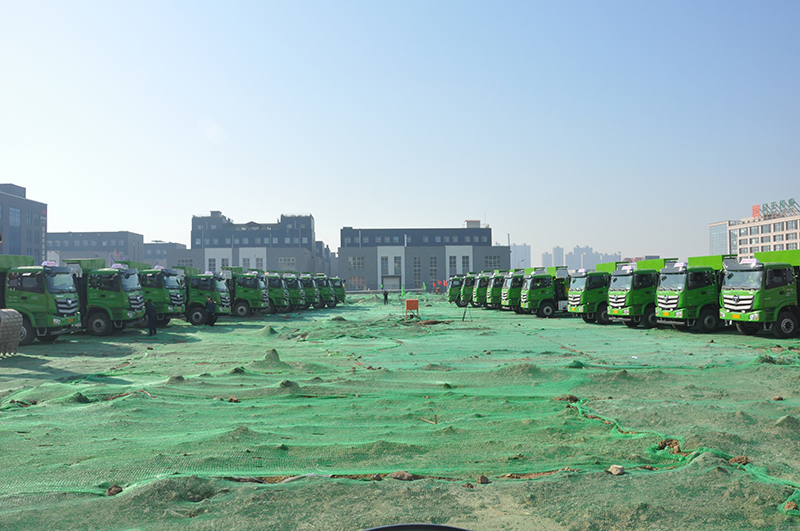在三河市重點項目集中開工現場會會場,大型機械裝備整齊排列,工人們整裝待發。